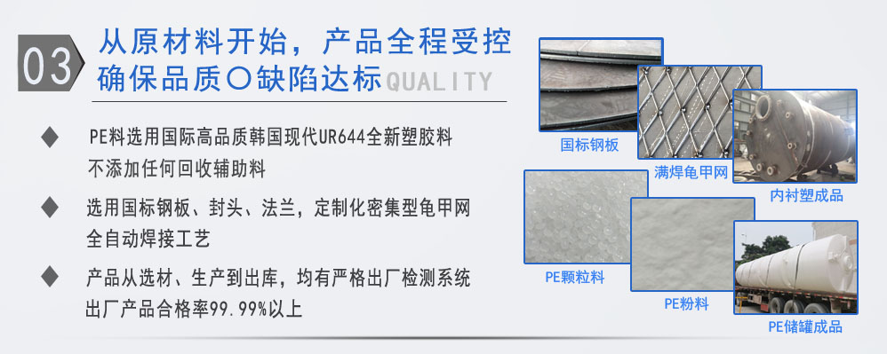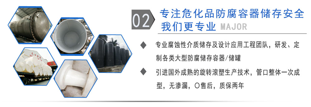 公司有鋼襯塑PE/PO、PE全塑、碳鋼、不銹鋼四大系列100多個品種,專注于常壓儲存容器生產,其產品包括鋼襯塑儲罐管口一體成型PE儲罐碳鋼儲罐、不銹鋼儲罐、反應釜、攪拌罐、離子交換柱、鋼襯PE/PO儲罐塑料儲罐、鹽酸儲罐、硫酸儲罐等等。更大限度滿足廣大客戶的各種需求,同時可以根據客戶的需要加工定制各種防腐設備。